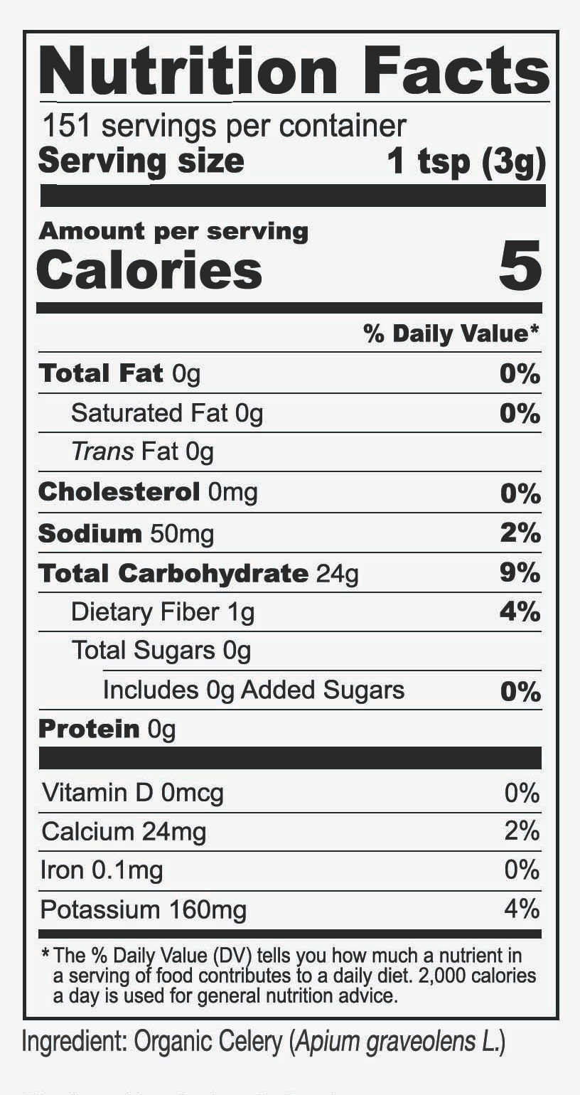- USDA Certified Organic Celery Powder – Made from certified organic celery and carefully ground into a fine powder.