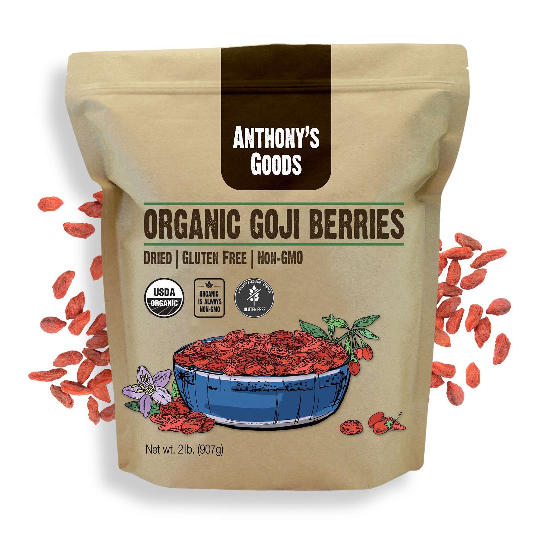 Anthony’s Dried Goji Berries are Organic, Gluten Free, Non-GMO, and Unsulphured.
