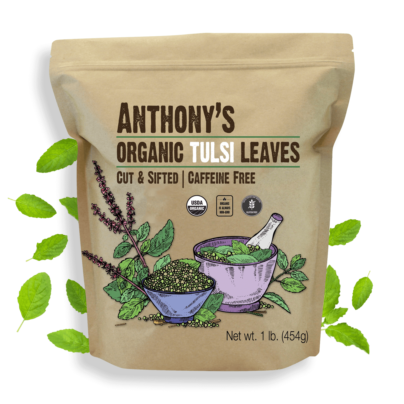 Anthony’s Tulsi Leaves are Organic, Cut & Sifted, Gluten Free, Non-GMO, and Caffeine Free.
